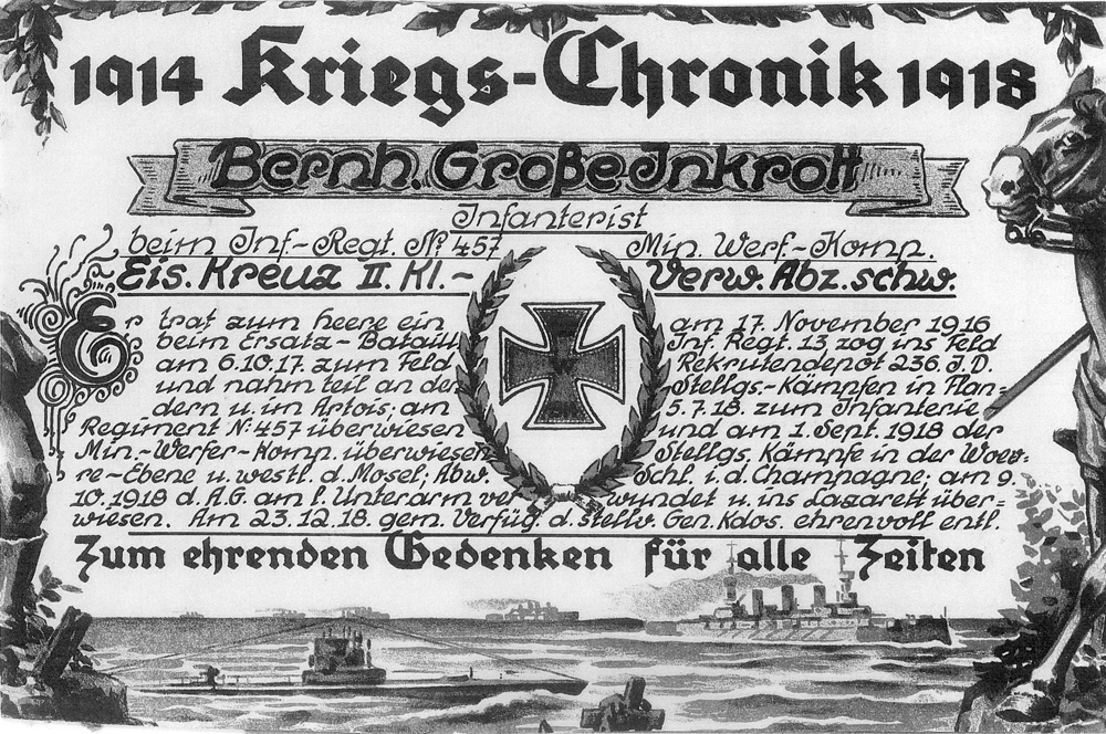 Zur Zeit [1931!] steht auch der Hof Grosse Inkrott unter dem Eindruck der nachhaltigen Folgen, die der furchtbare Weltkrieg für unser armes besiegtes Vaterland hat. Die Landwirtschaft befindet sich in schwerster wirtschaftlicher Notlage. Allüberall läuft der deutsche Bauernhof höchste Gefahr, dieser Wirtschaftskrise zum Opfer zu fallen. Indes, im Vertrauen auf den unermüdlichen Schaffensdrang und die tiefe Liebe zur angestammten, tausendjährigen Scholle, die den jetzigen Besitzer und seine ganze Familie beseelt, darf schon heute gesagt werden, daß der Hof Grosse Inkrott auch diese wirtschaftliche Krise siegreich überstehen wird.
